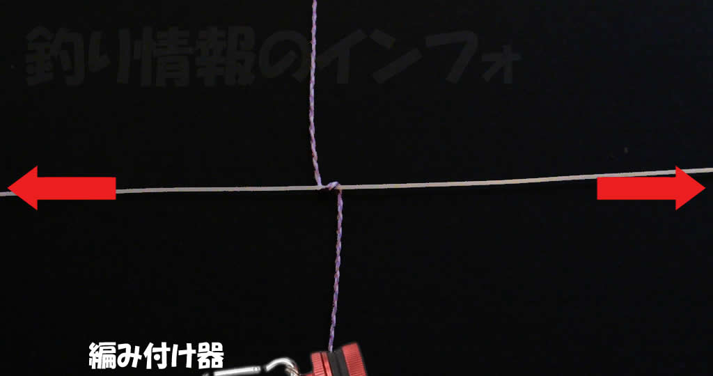 まずは、FGノットの結び方を図解解説するわけですが、上記写真のようにPEラインを盾に伸ばして下の方を「編み付け器」を使って固定します。「編み付け器」がない場合は、歯を使ってPEライン噛んで固定してもOKです。そして、PEラインの上にリーダーを横向きに伸ばして十字に各ラインを張ります。この時、FGノットの結び方が正しく出来るように、PEラインが下側でリーダーが上側になるようにします。