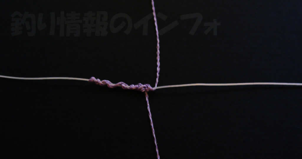逆Z字状にリーダーをくぐらせてから、左右に引っ張るとPEラインが更にリーダーに巻き付きます。PEラインに対して、リーダーをZ字下方そして逆Z字上方を1セット繰り返すと、上記写真のような結び目が交点にできます。FGノットの結び方は、ここまでの工程を1セットととします。