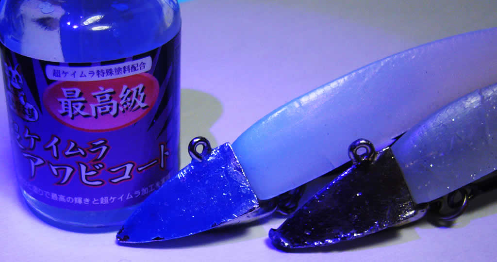 夕マズメは、明るい環境から暗くなりなすので、夕マズメのスタート時点ではまだ日の光が差し込んでいるので、ケイムラが効果的です。写真では同じシルバーのジグヘッドにケイムラコーティングをしているものと、していないものを紫外線ライトを当てて比較しています。ケイムラコーティングをしているジグヘッドの方は、ピカーンと光っているのが分かりますね。
