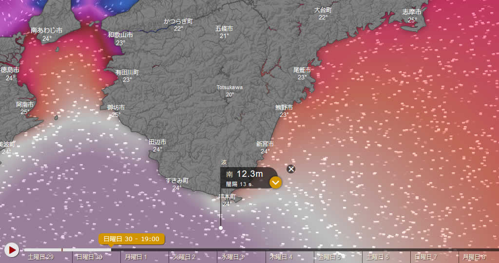 Windy天気サイトでは、このようにPCとスマートフォンでピンポイントでその地域の波の状態や台風の進路を調べることができます。上記Windyの地図上では台風が関西地域に上陸し、和歌山県の南部が強烈な暴風域に達していることがわかります。この30日(日曜日)19:00時点の台風接近予想図によると、Windyの右ナビから調べる項目を「風速」から「波」へタップまたはクリックをしたところ、南から12.3mの高さのある波が13秒間隔で発生することが分かります。
