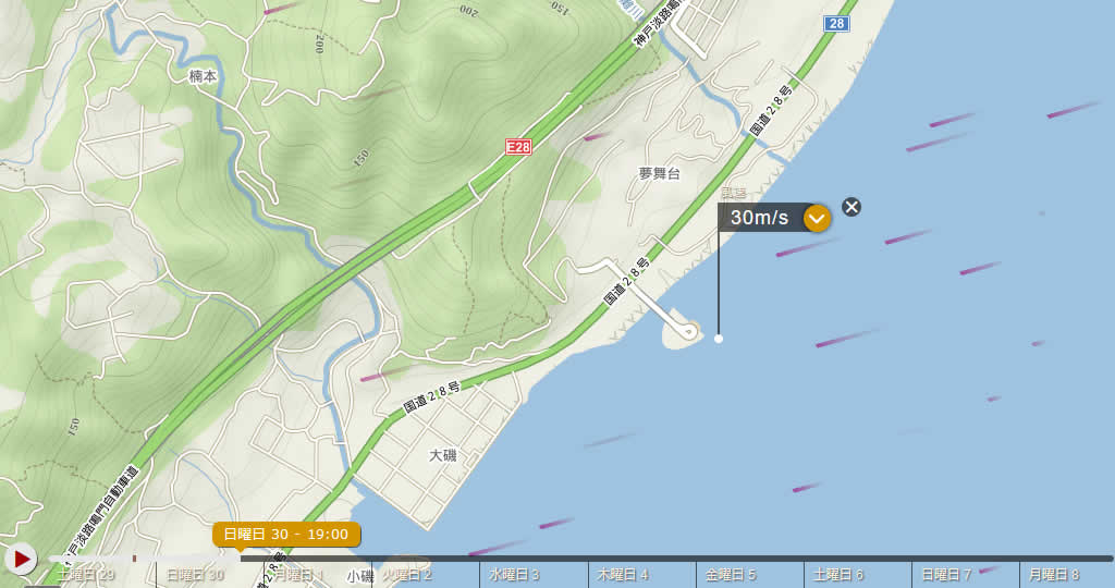 例えば、気になる地域の台風情報や風の状況、波の高さなどを更に超ピンポイントで調べたいときもWindy天気サイトが重宝します。上記地図は、淡路島の翼港周辺の拡大図ですが、ここまで超ピンポイントでその地域の現在のリアルタイム情報もしくは約9日先の天候までWindyを使って調査することができます。このWindyの地図も30日(日曜日)の19:00時点の台風影響による天候情報です。