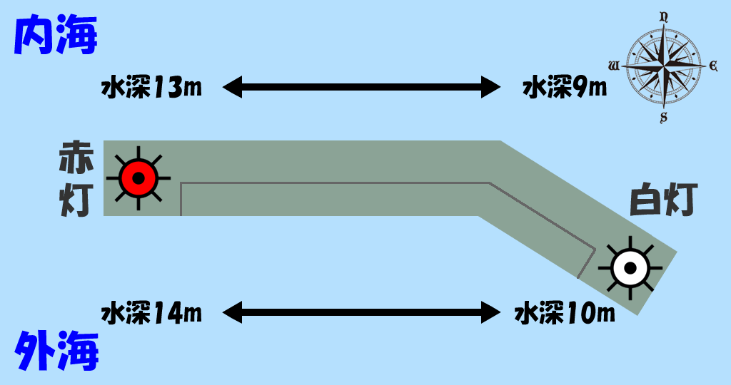 武庫川一文字の内海と外海では、内海の方が浅くそして外海の方が深くなっておりますが、武庫川一文字の防波堤で一番水深が浅いポイントは東側内向きで約9メートルです。一方で、武庫川一文字の堤防で一番水深が深いポイントは西側の外向きで約14メートルです。岸からの防波堤釣りをされる方は、防波堤の東西もしくは南北での移動によって水深がこの様に変化する釣りポイントがあまり体感された方もないと思います。